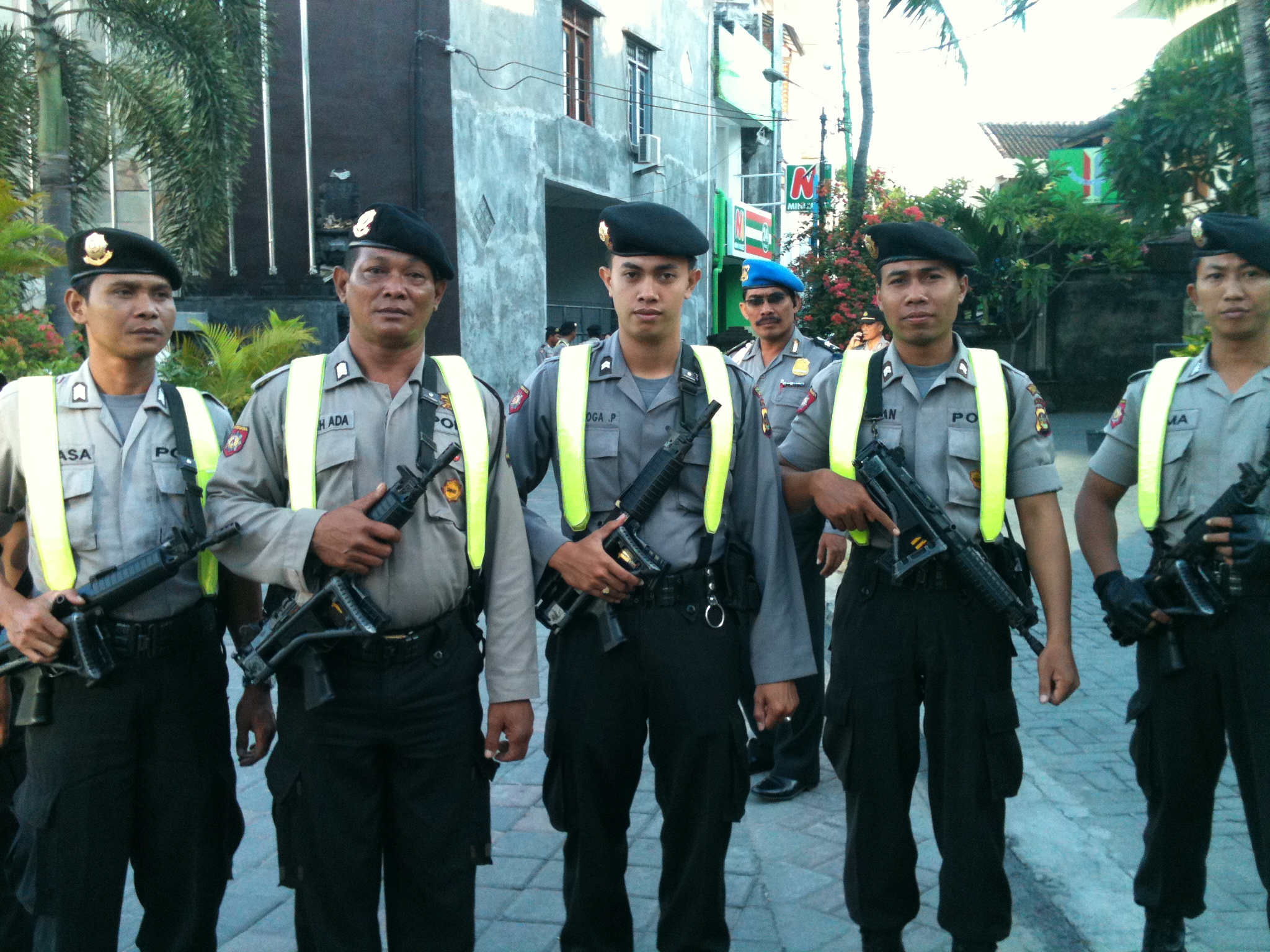 Security was tight. With the dozens of beret-clad and armed POLRI, squads of the special reaction unit (Gegana) dressed in black, military police, army, and rooftop snipers, journalists and onlookers were more concerned about getting on their wrong side that morning than of any terrorist attack.