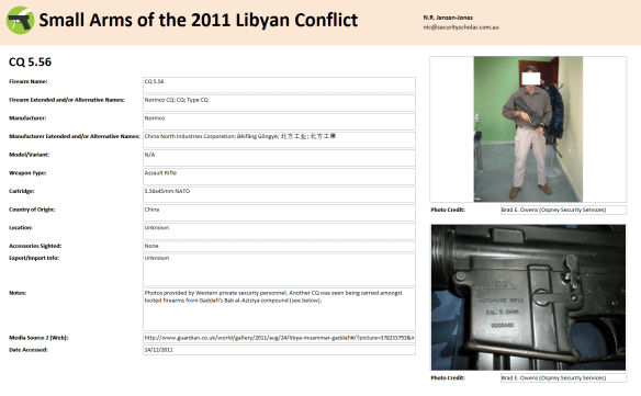 As a few of you probably know by now, I’m in the process of undertaking a pretty big research project. I’m attempting to compile a ‘complete-as-possible’ database of small arms used in the recent Libyan conflict. To do this, I’ve been collecting OSINT photos and video stills from a number of media outlets, social networking sites, and so on. I’m also working with some NGOs and PSCs on the ground in Libya, as well as having developed a few local sources of my own.